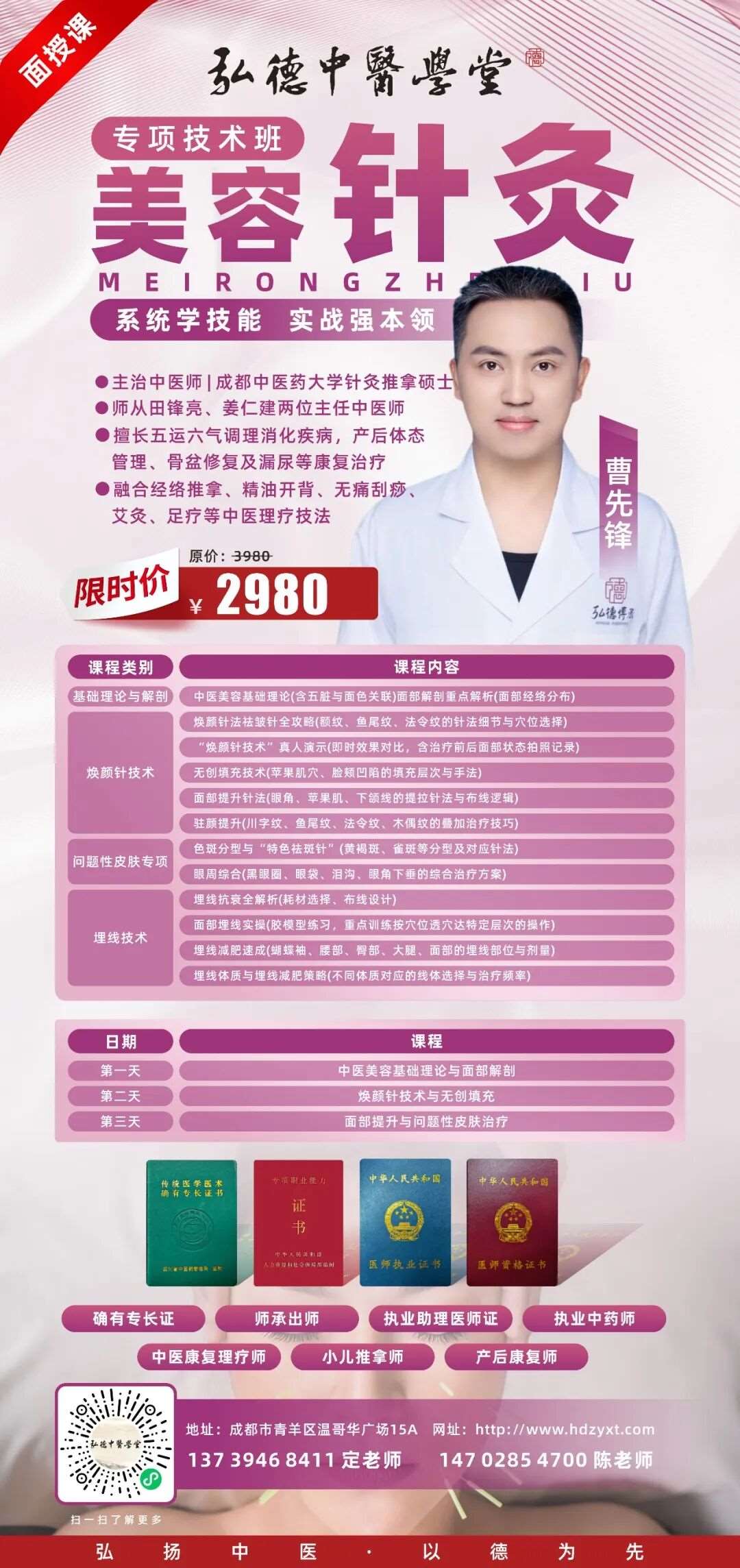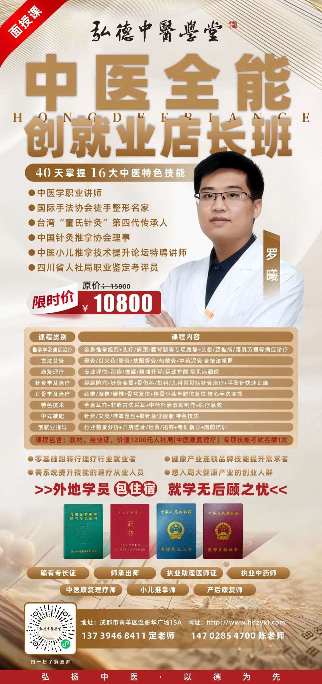 在弘德,我们教授的不仅是中医技能,更是一份长久的陪伴与支撑。我们深知,学习一门手艺,或许会因生活、家庭等各种原因暂停,但这份对技能的热爱、对更好生活的追求,不该被辜负。无论是产后复工、技能生疏,还是久未实操、想重新拾起手艺,弘德的免费复学福利,始终为你保驾护航。报名一次,终身可免费复学,专业老师全程指导,帮你快速重启技能之路,无后顾之忧地深耕中医手艺。